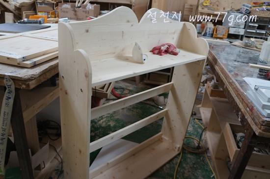 격자로 끼워질 촘촘선반을 샌딩하고 있습니다.