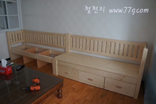 침상 마루 구조의 원목 소파를 만들었습니다.