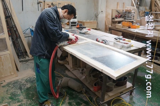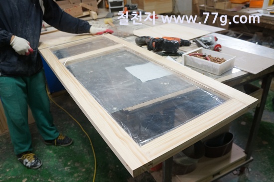 현관 중문 제작 하는 사진 입니다. 깨지지 않는 렉산을 끼워서 만듭니다.