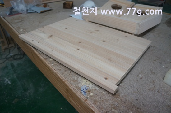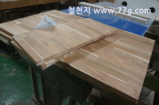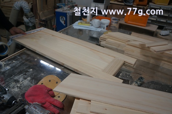 문짝을 제작하기 위해 45도 재단을 하고 있습니다.
