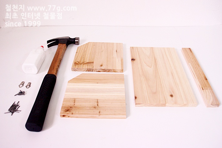 목재는 12mm 집성 원목을 사용 하여 친환경 적인 제품입니다, 기본 목제 구성과 고정 못, 벽 고리로 구성 되어 있어요, 망치와 목공 본드