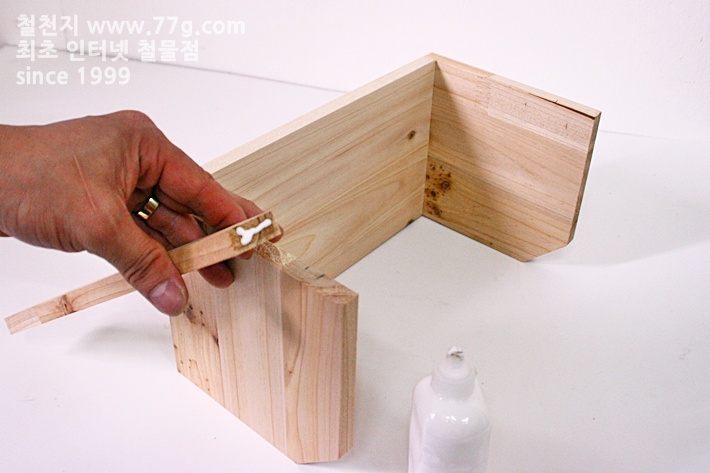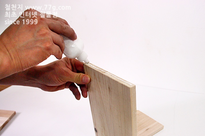 모든 조립시에 목공 본드를 바르고 조립하셔야 튼튼합니다. 우선 측 판을 고정 합니다.