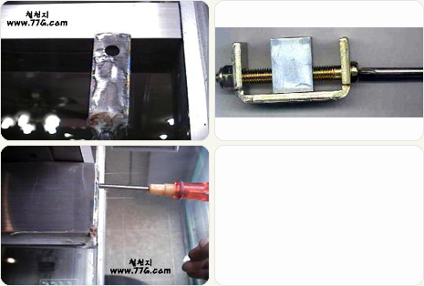 틈새를 벌려 실리콘을 가득 메워두고 각파이프를 댄후 C클램프로 압착한후 16시간 이상두면 단단히 고정되어 있을것이다.