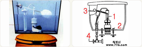 아래는 가장 일반적인 형태의 변기 부속 투시도와 개념도이며 좌측은 일반형 우측은 저소음절수형 부속이다.