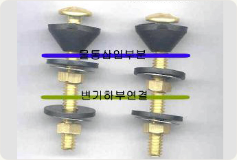 변기 고정볼트를 조여 준다. 원뿔모양의 고무부속 모양이 찌그러질 정도로 조여 주어야만 물이 새는것을 방지 할수 있으며