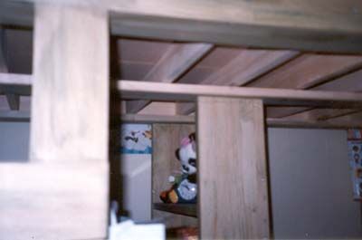 침대 하단 18mm 집성목을 세워서 지지함. 기둥과 기둥이 흔들리지 않도록 긴 가로대 설치