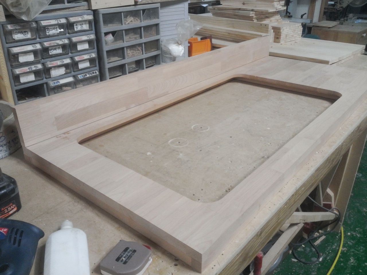 싱크대상판 원목(특수목) 36mm(뒷턱포함,싱크볼 별매)(1.볼규격 JS850)(오리나무) (1900*36*550)(샌딩)(1개)