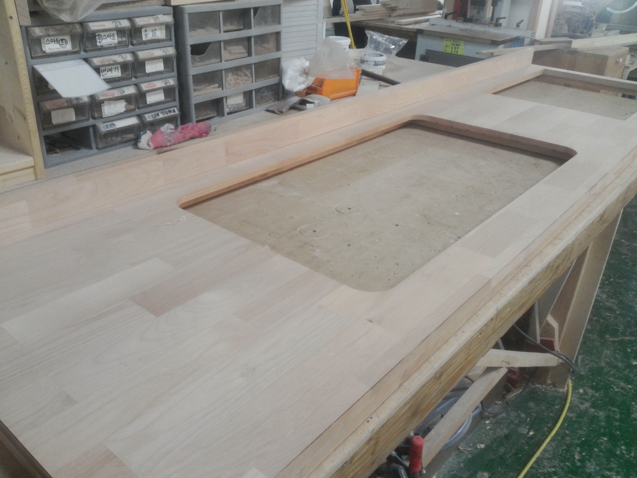 싱크대상판 원목(특수목) 36mm(뒷턱포함,싱크볼 별매)(1.볼규격 js850)(오리나무) (2650*36*600)(1개) 318,060원