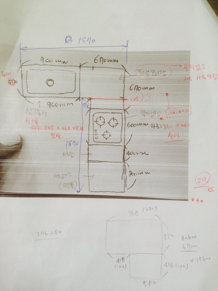 싱크대 ( 하부장3668 mm * 700 mm * 570 mm)(스프러스문짝)(64mm)(내부장 백색) 931,870원