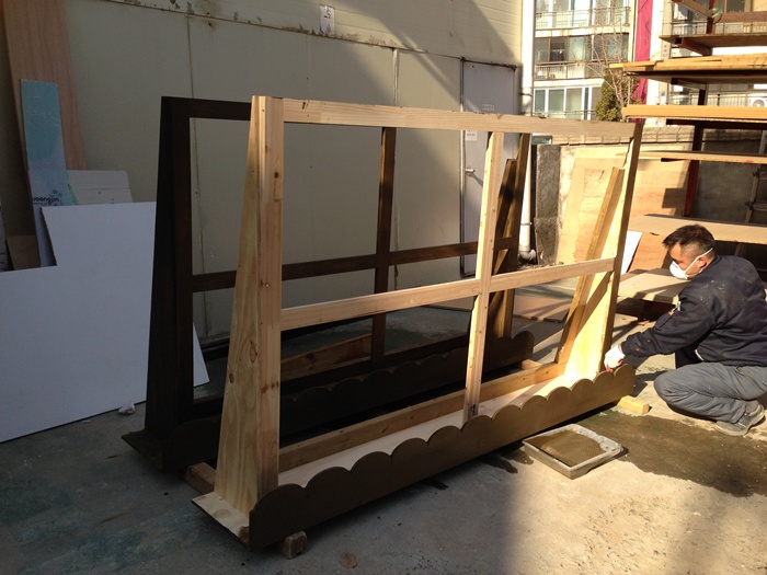 추위를 방지 할수 있는 덧창문을 목재로 제작 하고 있습니다.