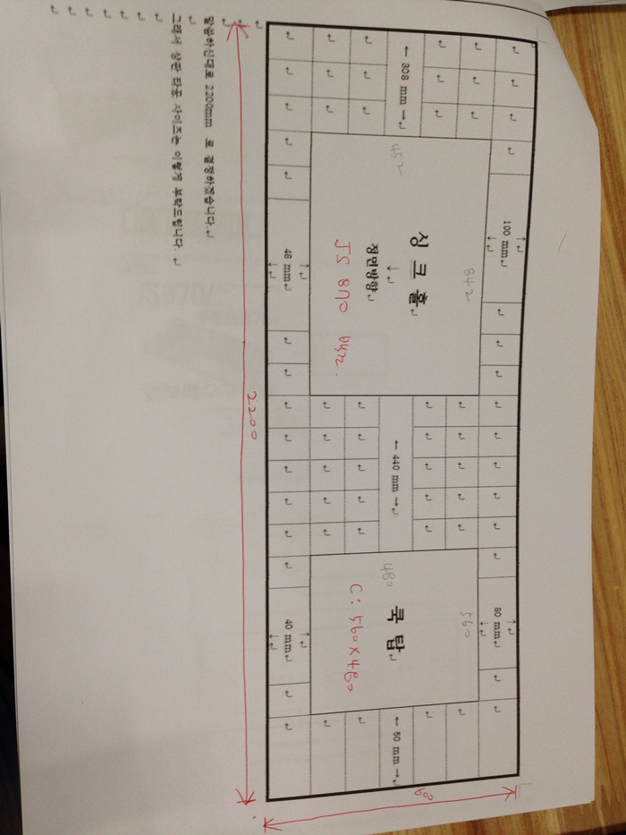 싱크대상판 원목(특수목) 36mm(뒷턱포함,싱크볼 별매)(기타볼(도면))(오리나무) (2270*36*600)(1개) 303,870원