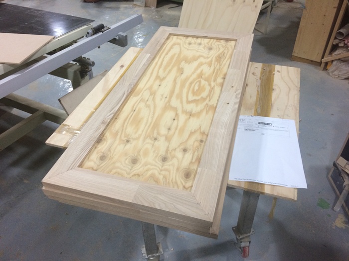 싱크대문짝,435*950*4장,외(애쉬(물푸레) side finger 24mm),내(낙엽송 엠보 4.8mm),손잡이(중앙 우 96mm),경첩가공(무),(오일마감)