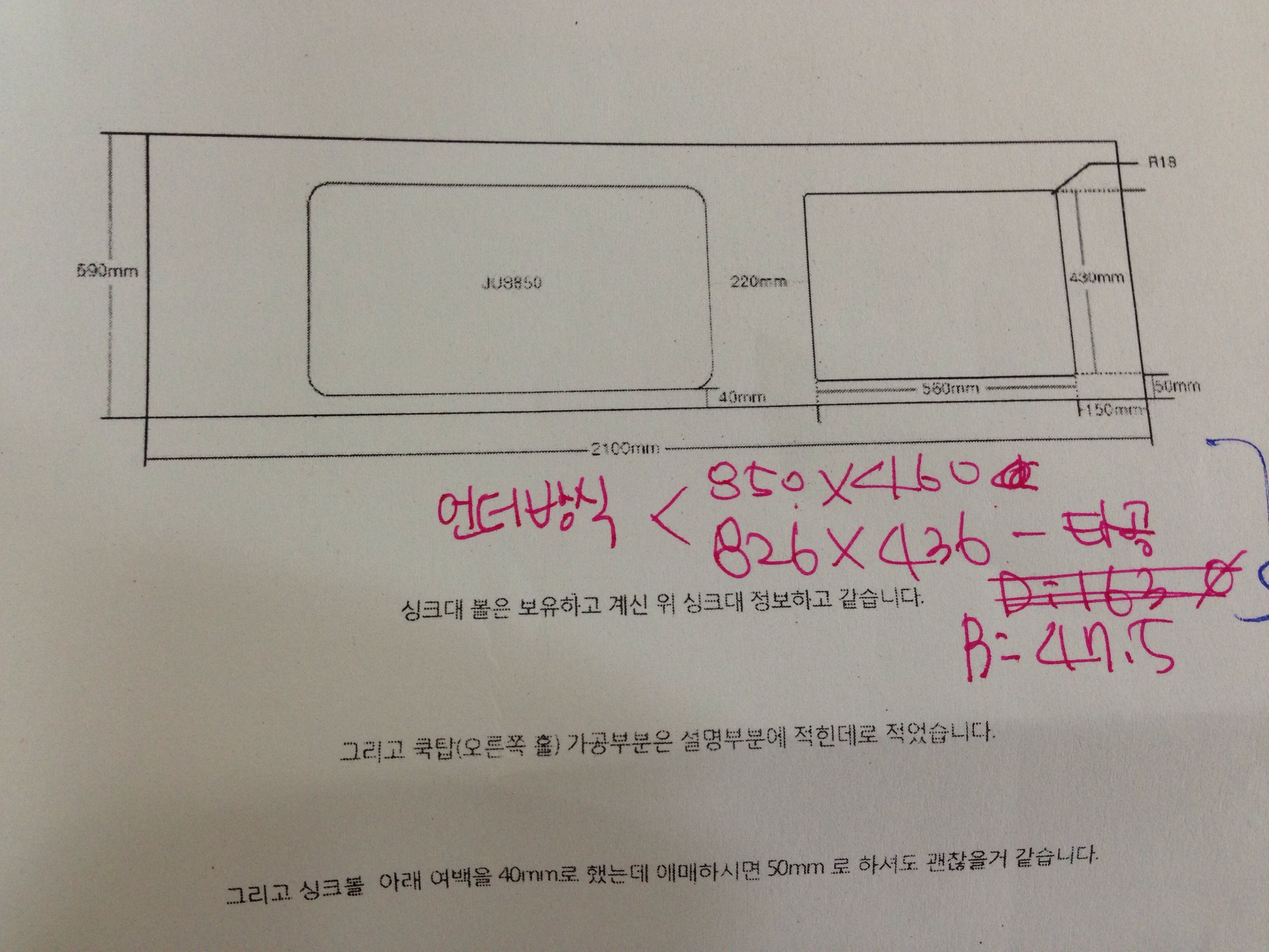 원목(특수목) 싱크대상판 쿡탑(가스렌지) 가공비용 20,000원