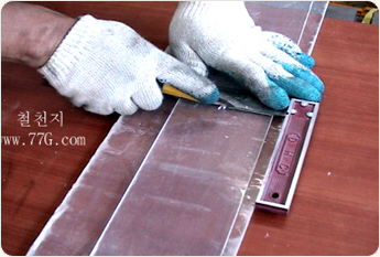자를 대고 아크릴 칼을 꾸~욱 누르면서 2회 긋는다. (이때, 자가 흔들리지 않도록 하며, 긴 경우 자를 바이스로 고정하여 사용한다.)