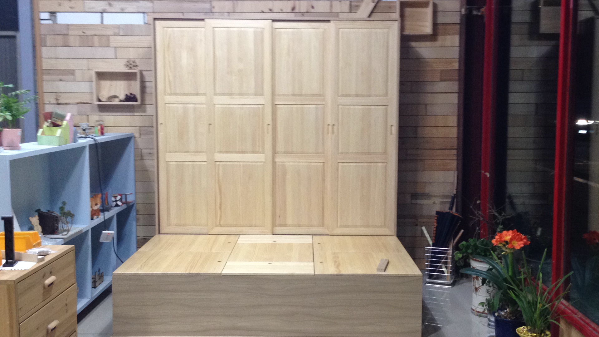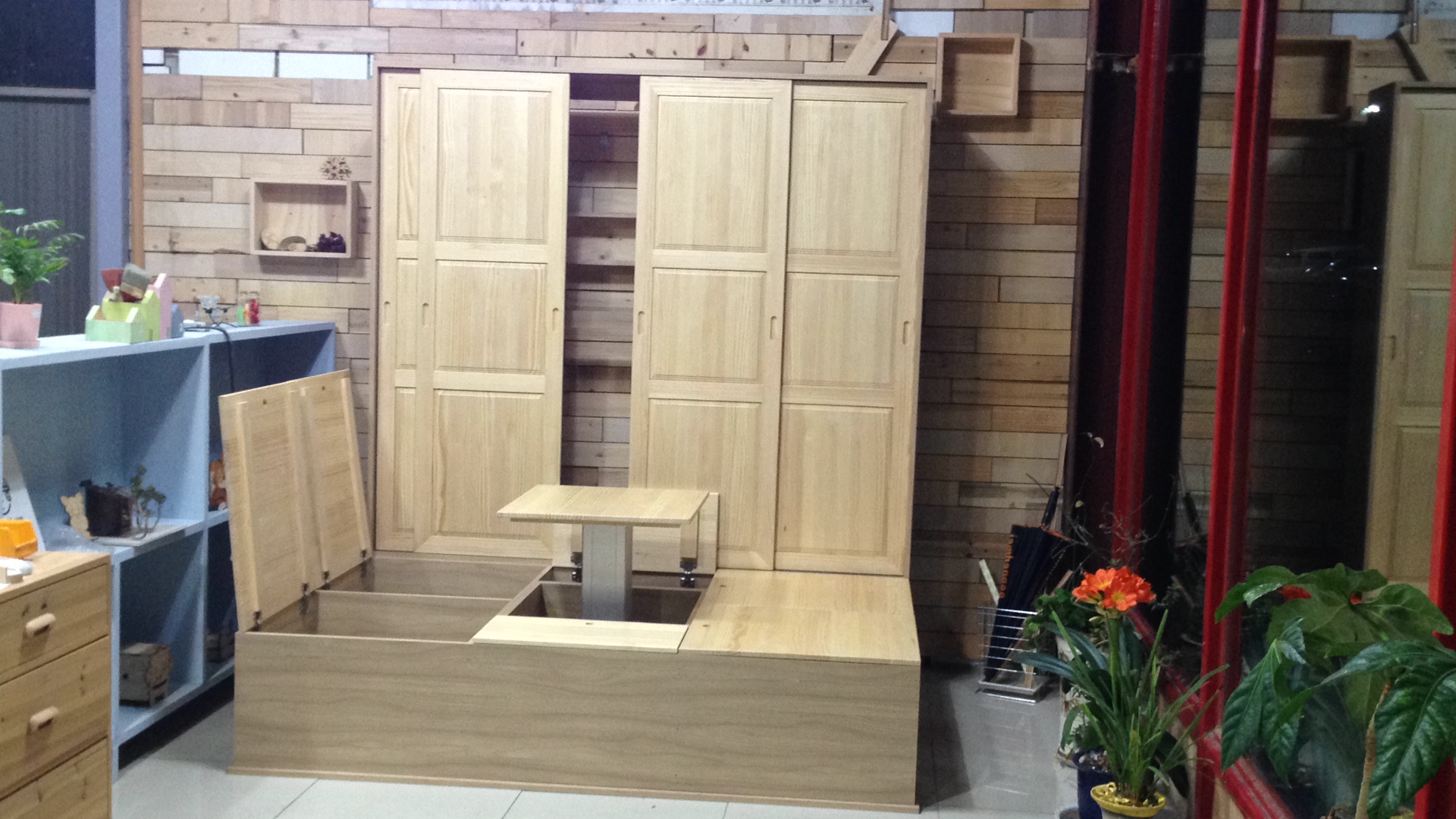 수납침대와 미닫이 붙박이장의 복합된 형태를 만들었습니다.