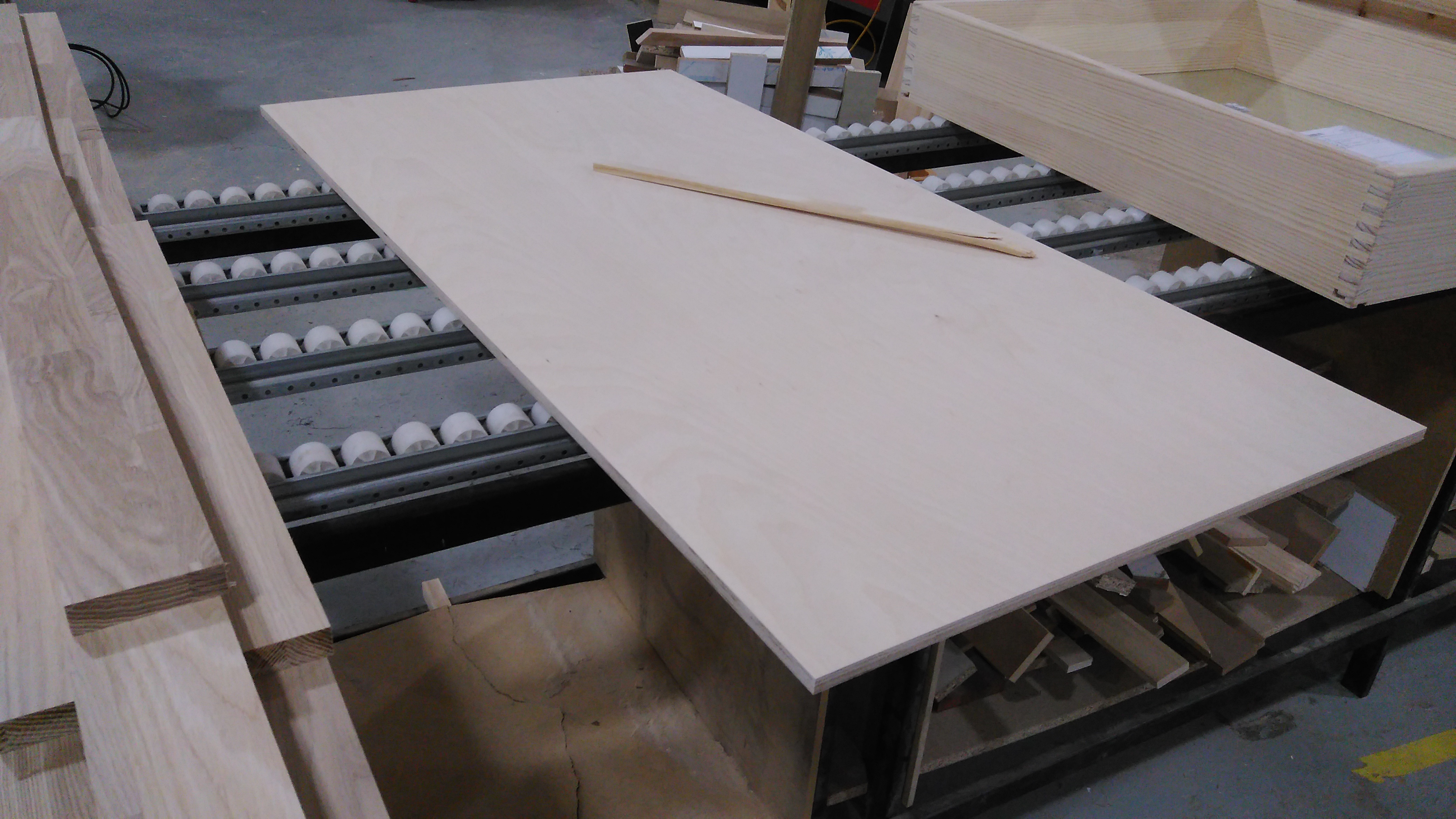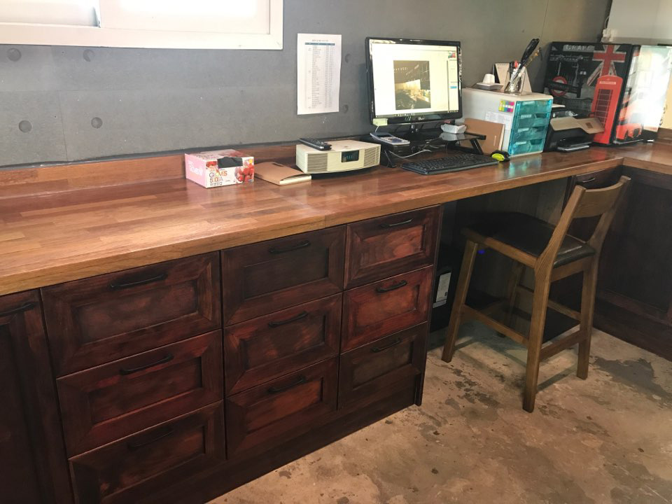 쇼룸의 멀바우 테이블에 색을 칠하고 있습니다.