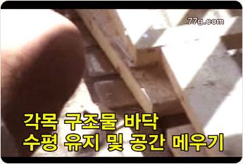 수평계를 이용하여 목재 수평을 잡기 위한 바닥목재를 절단하여 끼워 놓고, 못과 목공 본드등로 고정을 합니다.