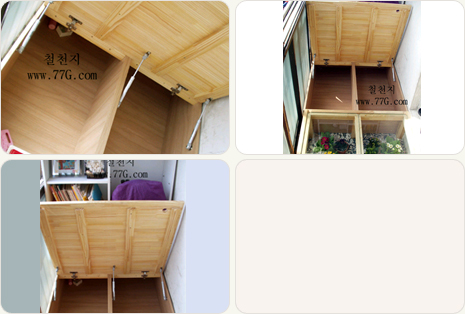 일반 공간박스형 구조에 덧댈수 있는 뒷판을 15mm 로 사용하고, 문짝을 보강하여 휘거나 흔들리지 않도록 한후, 쇼바를 이용하면 문을 쉽게 여닫을수 있습니다.