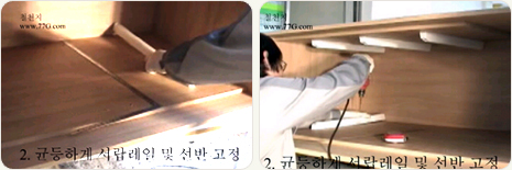 중간 선반은 나사못 3개씩을 이용하여 양쪽에서 고정을 해준후 서랍을 레일에 끼웁니다.나사못은 #3.5X38mm 3개를 고정 해줍니다.