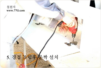 경첩홈을 파둔 문짝에 경첩을 나란히 나사못을 이용 하여 고정을 합니다.