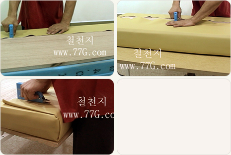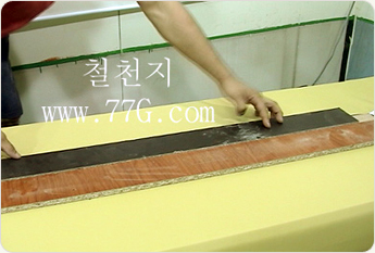 인조 가죽위에 스펀지를 2장 올리고, 그위에 나무판을 대세요.