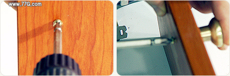 뒷판에 두개의 나사를 각각 적당히 돌려 넣으시고, 손잡이를 앞판에 놓고, 뒷판 나사를 드릴로 다음과 같이 조입니다.