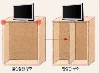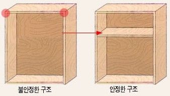그러므로 오른쪽 테이블과 같이 무거운 물체를 올려놓는 지점에 가로대(선반)을 끼워 힘을 분산 시킴으로서,