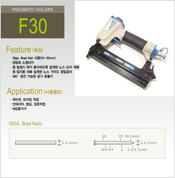 일반적으로 사용되는 타카의 종류를 보면, 우측의 F30은 일반적인 목재용 못 대신 사용하는 제품입니다.