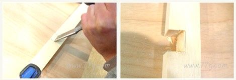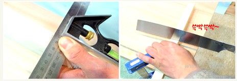 일단 홈을 파야 하기 때문에 나무에 직각자를 대고,정확한 칫수로 선을 그어 줍니다. 그어진 선을 따라 톱질을 합니다.