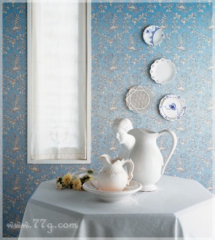트왈블루의 이국적인 패턴과 시원스런 블루칼라는 화이트,아이보리톤과 매치되어 더욱 환하고 시원한 분위기를 연출합니다.
