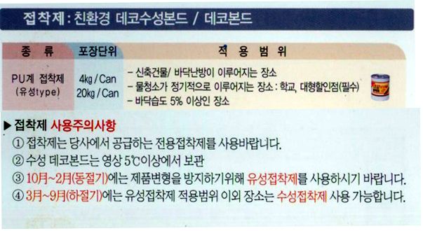 참고로 제조 업체의 본드 재질과 주의 사항 유지 관리, 시공 조건표를 올려 둡니다.