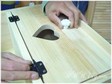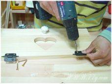 뒷판을 튼튼하게 고정하기 위해 피스 45도로 박는거 다 아시죠?? 이제 하트 문짝에 경첩을 먼저 달고,손잡이도 위치 정해서 달아주세요~