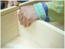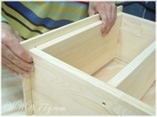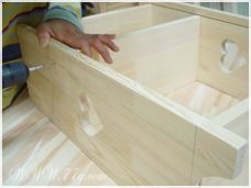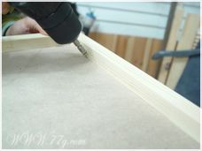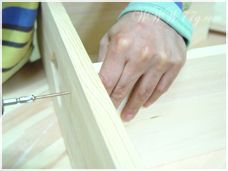 윗 상판은 윗선반쪽에서 상판쪽으로 사진과 같이 피스로 고정해줍니다. 자~거의 기본틀이 완성이 됐죠?? 뒷판을 홈에 맞춰 끼우고~
