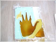 색칠된 밀랍 모형에 접착제를 고루 발라 주세요.뒷면에다가~ 그리고나서 액자 중앙에 잘 붙여 주세요.