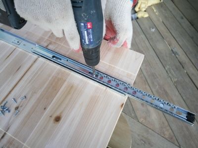 서랍에 부착될 레일 부속을 기둥 위치와 만나는 부분에 맞추어 표시를 하고 #3x16mm 나사못을 이용하여 고정을 해줍니다.