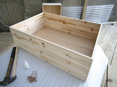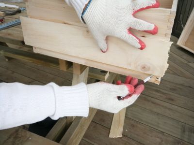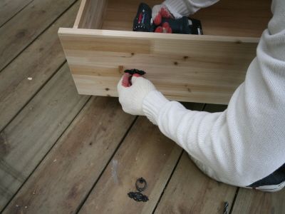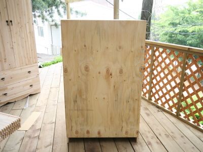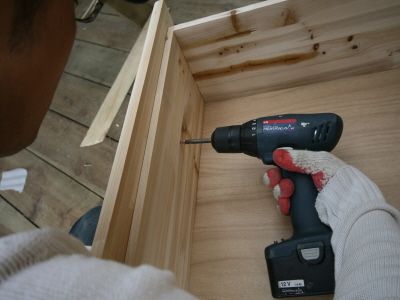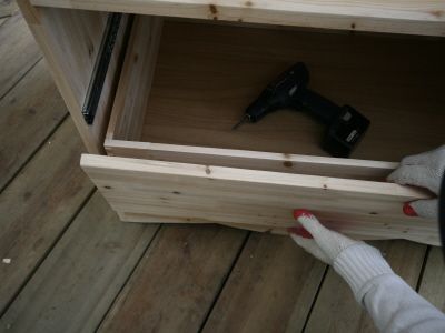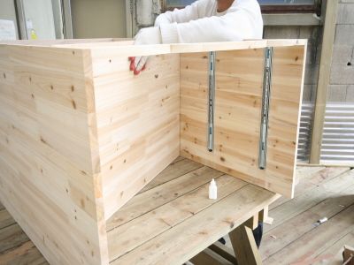 ㄱㄷ 형태가 된후에는 뒷판을 끼워 줍니다.그리고, 오래된 서랍가구의 고질적인 문제인 서랍 밑판이 빠지는 문제를 해결 하기 위해 하단에 목재를 덧대서 고정을 해줍니다.