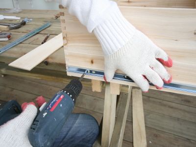 서랍에 부착될 레일 부속을 기둥 위치와 만나는 부분에 맞추어 표시를 하고 #3x16mm 나사못을 이용하여 고정을 해줍니다.
