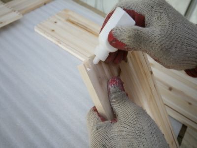 우선 뒷면 접합부에 목공본드를 발라 뒷판을 붙여 고정시킵니다.