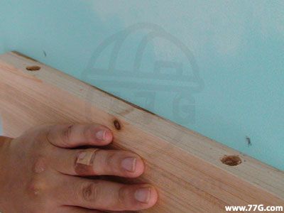 설치할 벽면에 선반을 대고, 기둥을 고정시킬 위치를 정합니다.