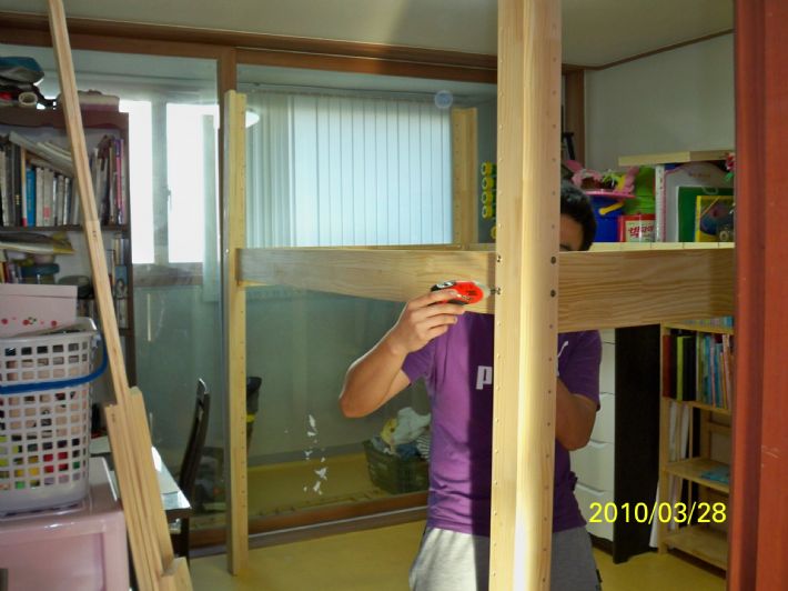 7. 기둥에 침대 깔판받침 연결 및 전동 드릴로 튼튼하게 고정시키기