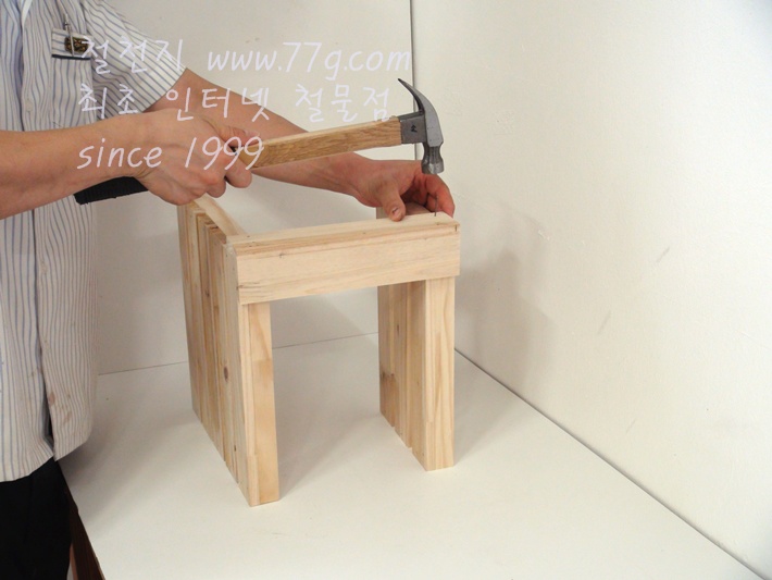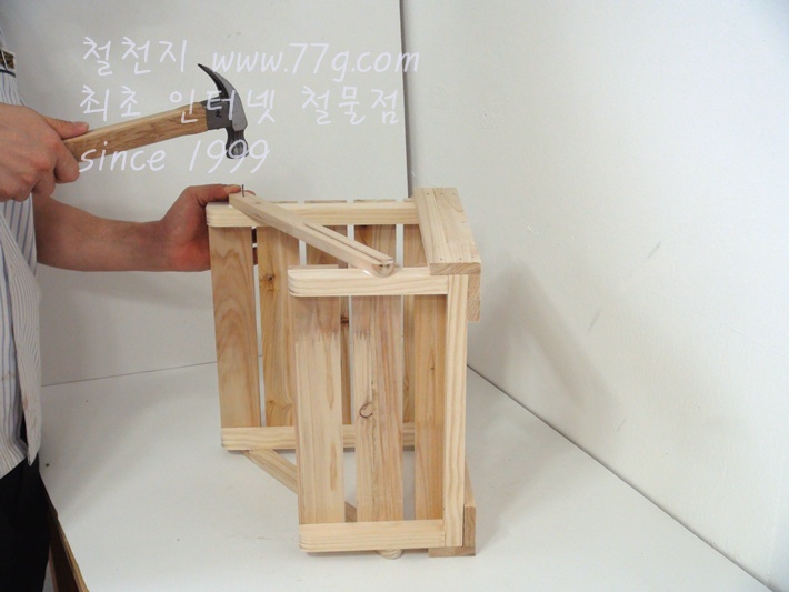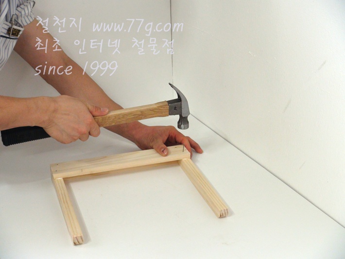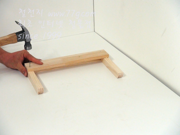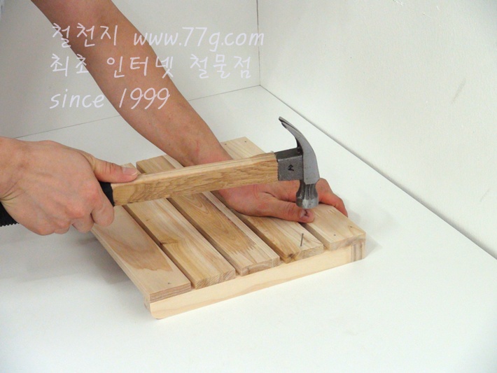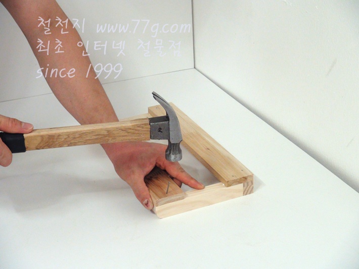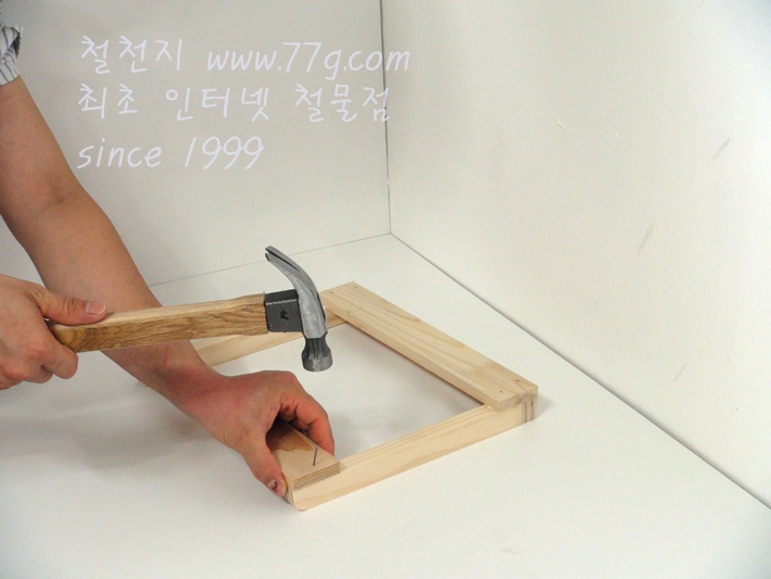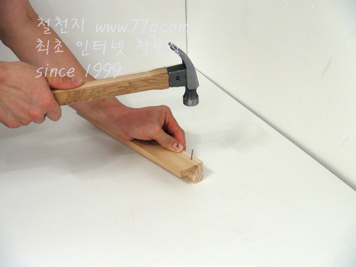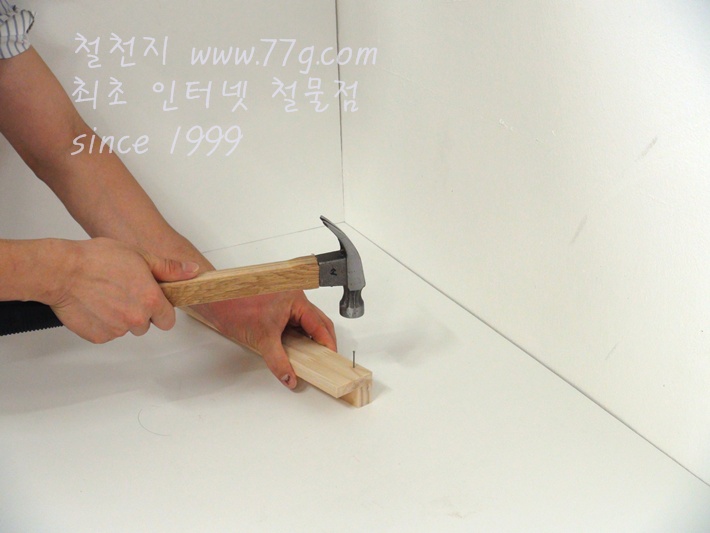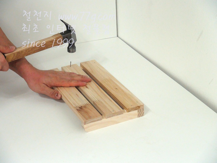 못으로 고정하세요, 못을 미리 살짝 박고 고정하면 훨씬 못질이 수월합니다,