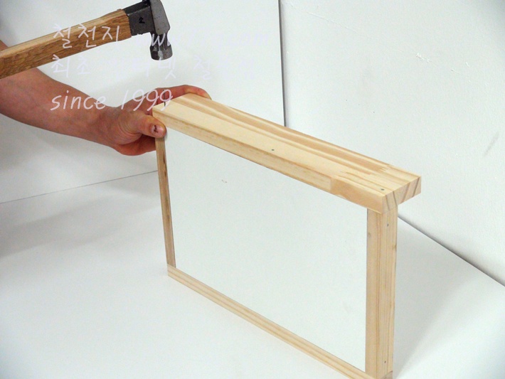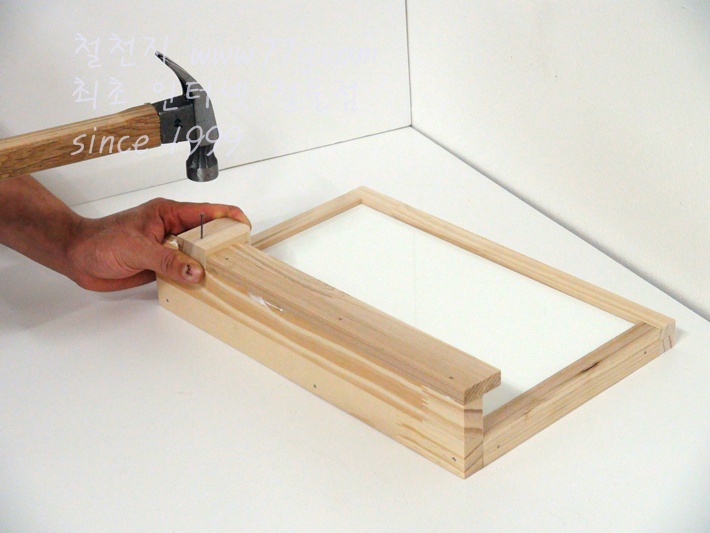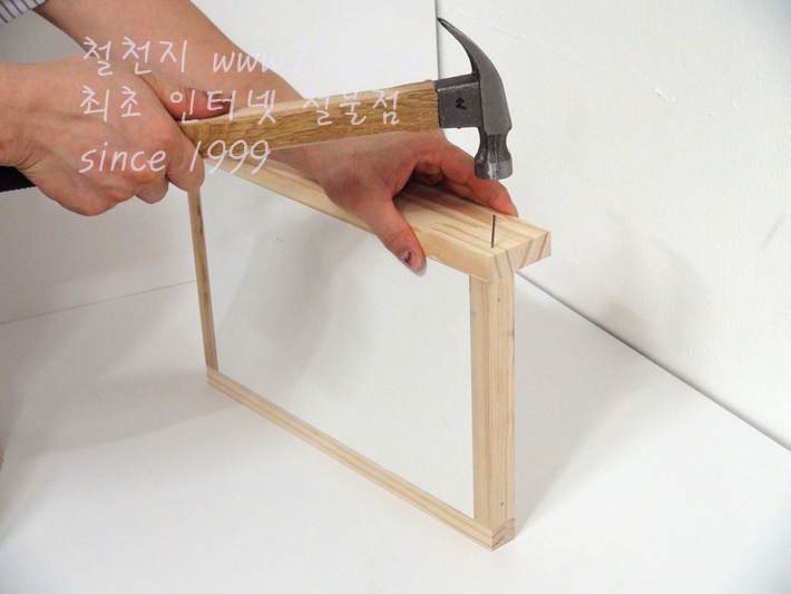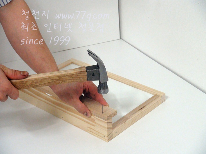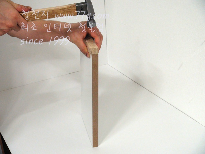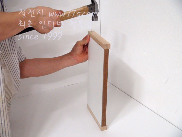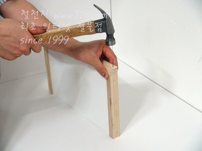 미리 목재에 못을 살짝 박으시고 고정하시면 못질이 훨씬 수월합니다,
