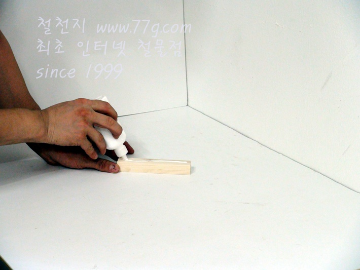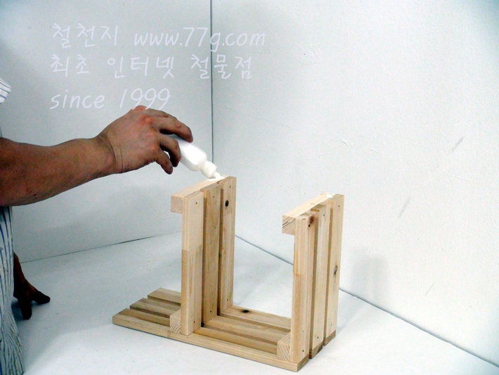 상판과 중간판을 먼저 조립합니다, 기둥이 될 부분에 목공본드를 미리 바릅니다.